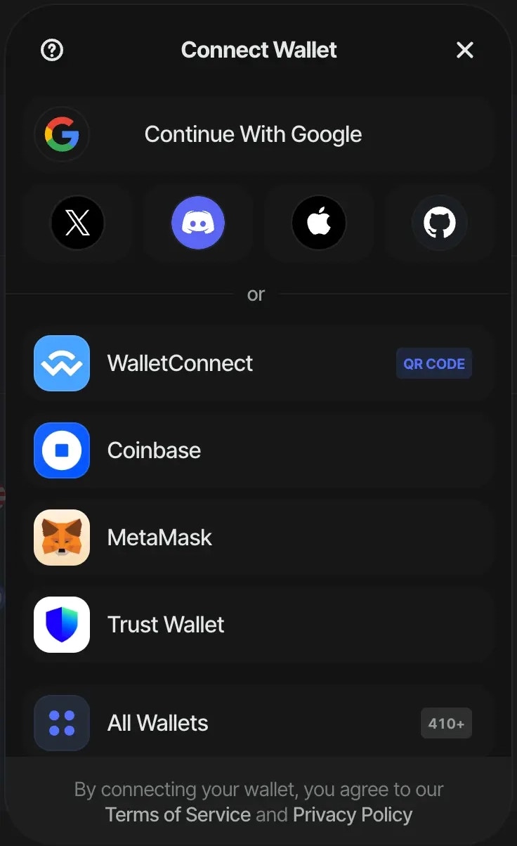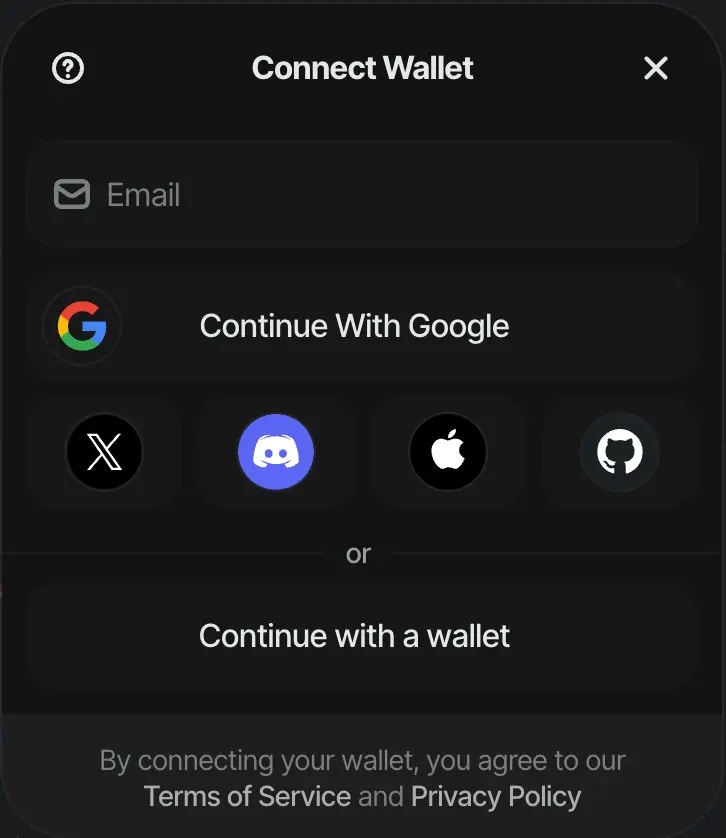 • socials [array] : This array contains the list of social platforms that you want to enable for user authentication. The platforms in the example include Google, X, GitHub, Discord, Apple, Facebook and Farcaster. The default value of undefined displays everything. Set it to false to disable this feature. You can also pass an empty array to disable it.